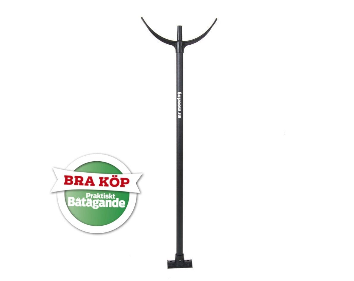 Tamphållare Mr Mooring – Flexible. En utveckling av Mr Mooring original men med skillnaden att det är en rostfri fjäder monterad i foten. Fjädern är kraftig nog att hålla tamparna på plats även om det blåser bra. Om olyckan är frame och båten fastnar i pinnen så viker den sig. Gör förtöjningen enkel genom att du inte behöva luta dig över relingen. Passar både Y-bom och stolpe/pollare. Tamphållaren är tillverkad av slagtålig och UV-skyddad HD polyeten och polykarbonat. Enkel installation på Y-bom med buntband (ingår) och på brygga/stolpe/pollare med skruv. Mr Mooring är svensktillverkad och 100 % återvinningsbar. Tips! Kan med fördel delas med grannbåten, eftersom det finns plats för minst två tampar.