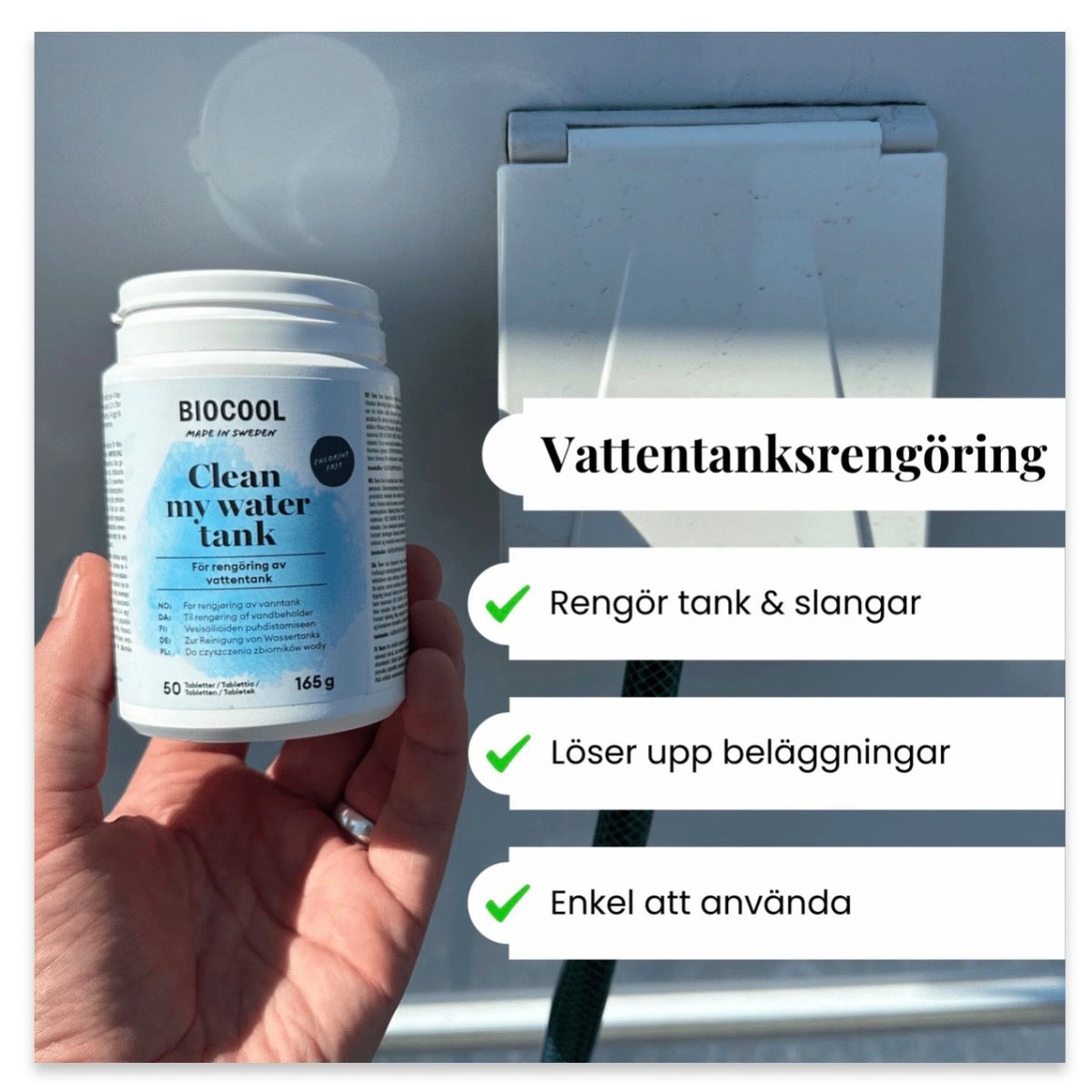 I tankar och slangar med stillastående vatten bildas oundvikligen beläggningar. Biocool Clean my water tank rengör med minimal handpåläggning insidan av både tank, slangar och kranar utan att avge smak eller lukt. Avsedd för alla typer av tankar i såväl husvagn, husbil, båt och fritidsboenden. För bästa resultat, rekommenderar vi rengöring av vattentanken 2–4 gånger per аr