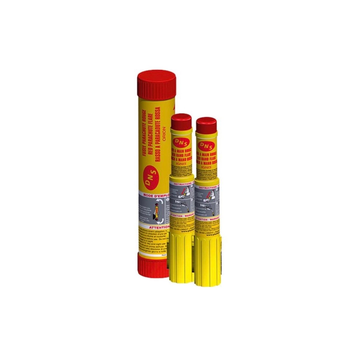 estår av 2 st röda handbloss och 1 st röd fallskärmsraket.